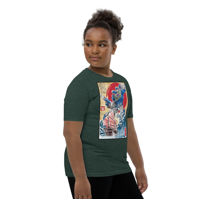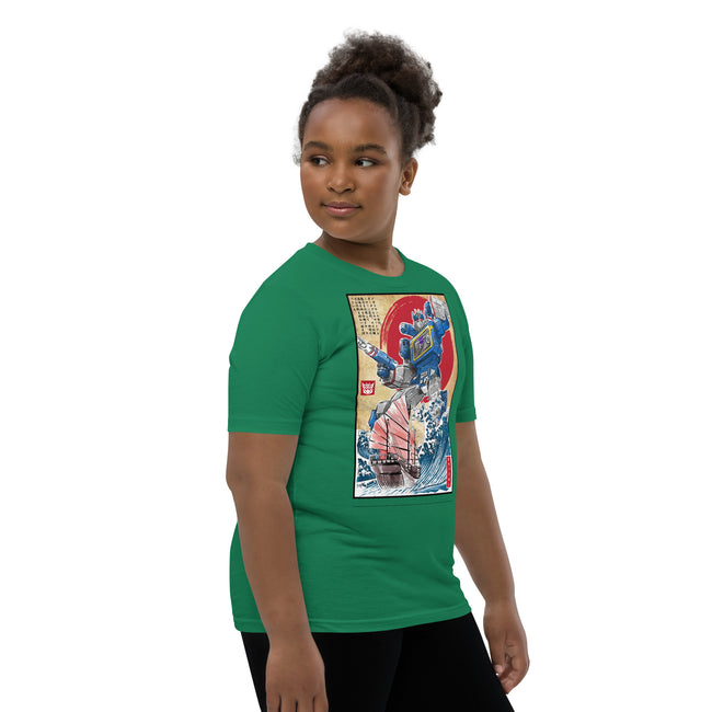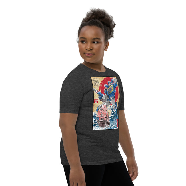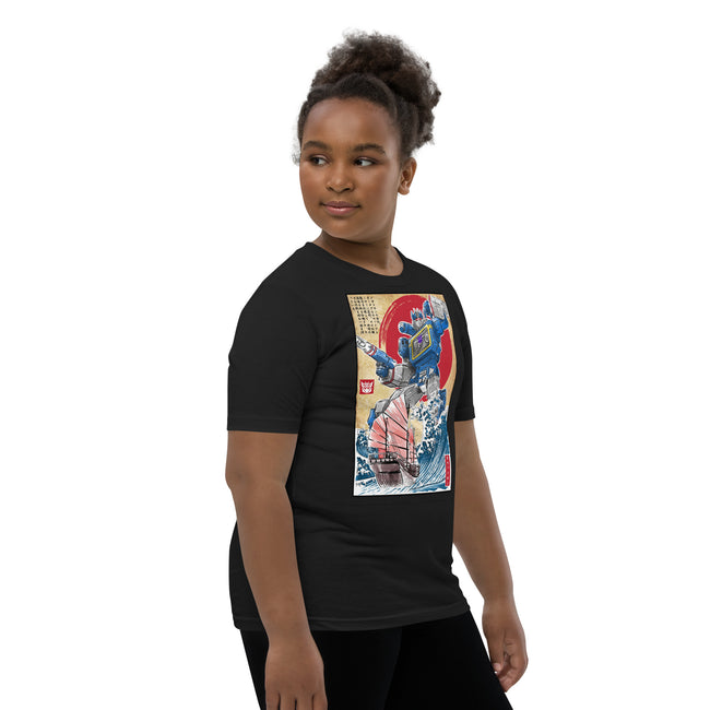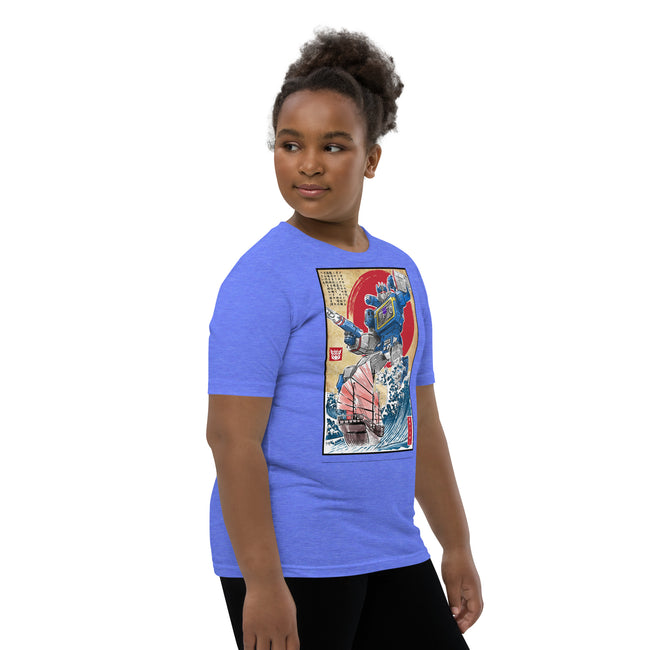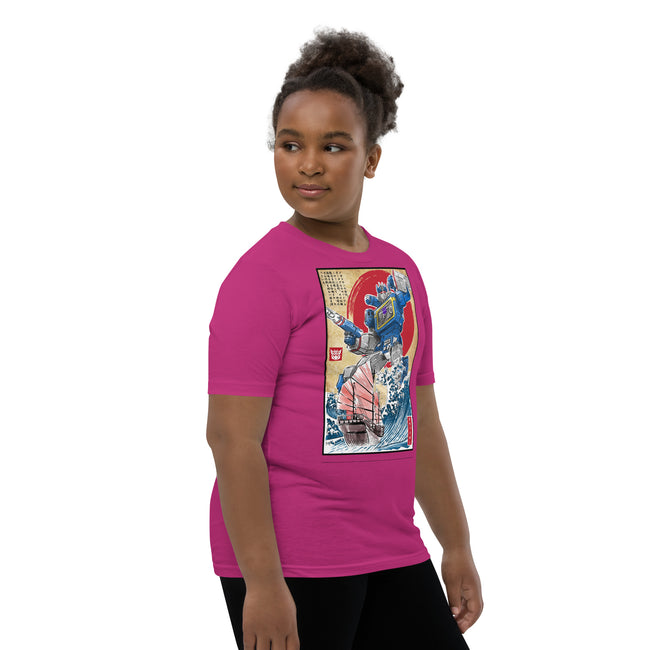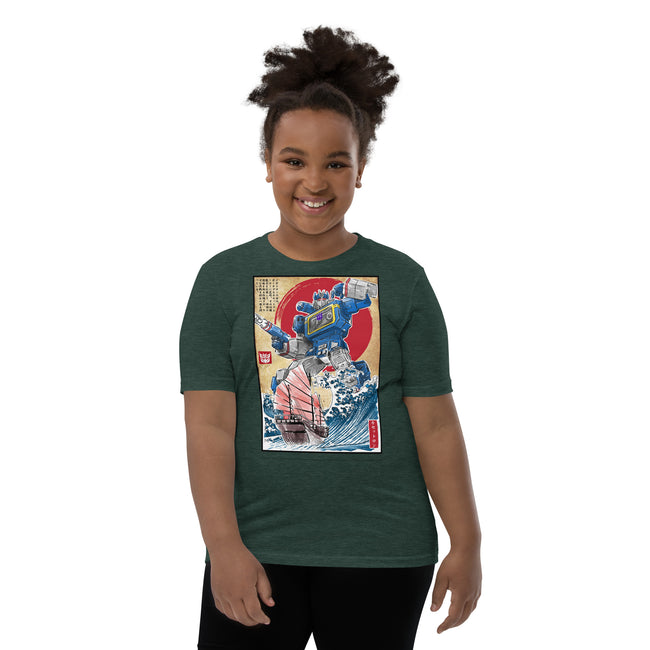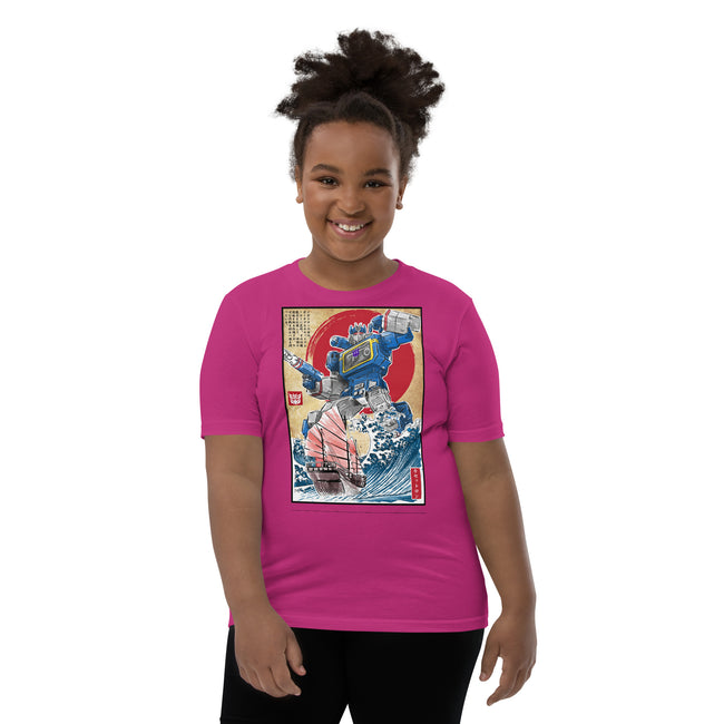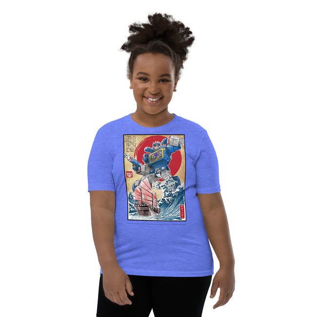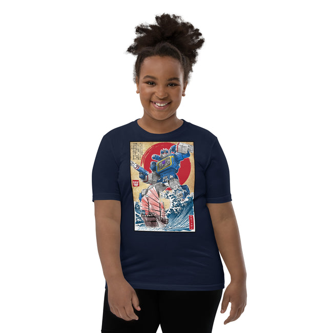 Front and center, the t-shirt boast a high-definition print of the iconic Decepticon, Soundwave. Recognized for his unmistakable cassette deck chest design and unyielding loyalty, the high-quality graphics pay tribute to Soundwave's unique features and capture the intrigue of his character in stunning detail.